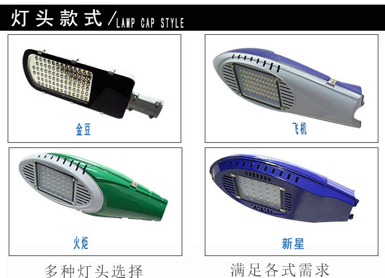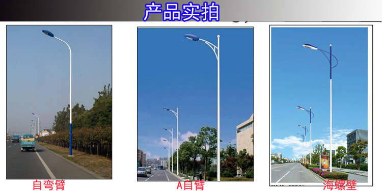 该种配置适合农村道路在3米-5米宽的,根据大家喜好5米路灯杆造型有自弯臂、A字臂、后弧臂、之字臂等,20瓦大功率led路灯头有小金.豆、白绿/白蓝火炬、小新星、飞机灯头、富贵鱼等多种款式可供选择。