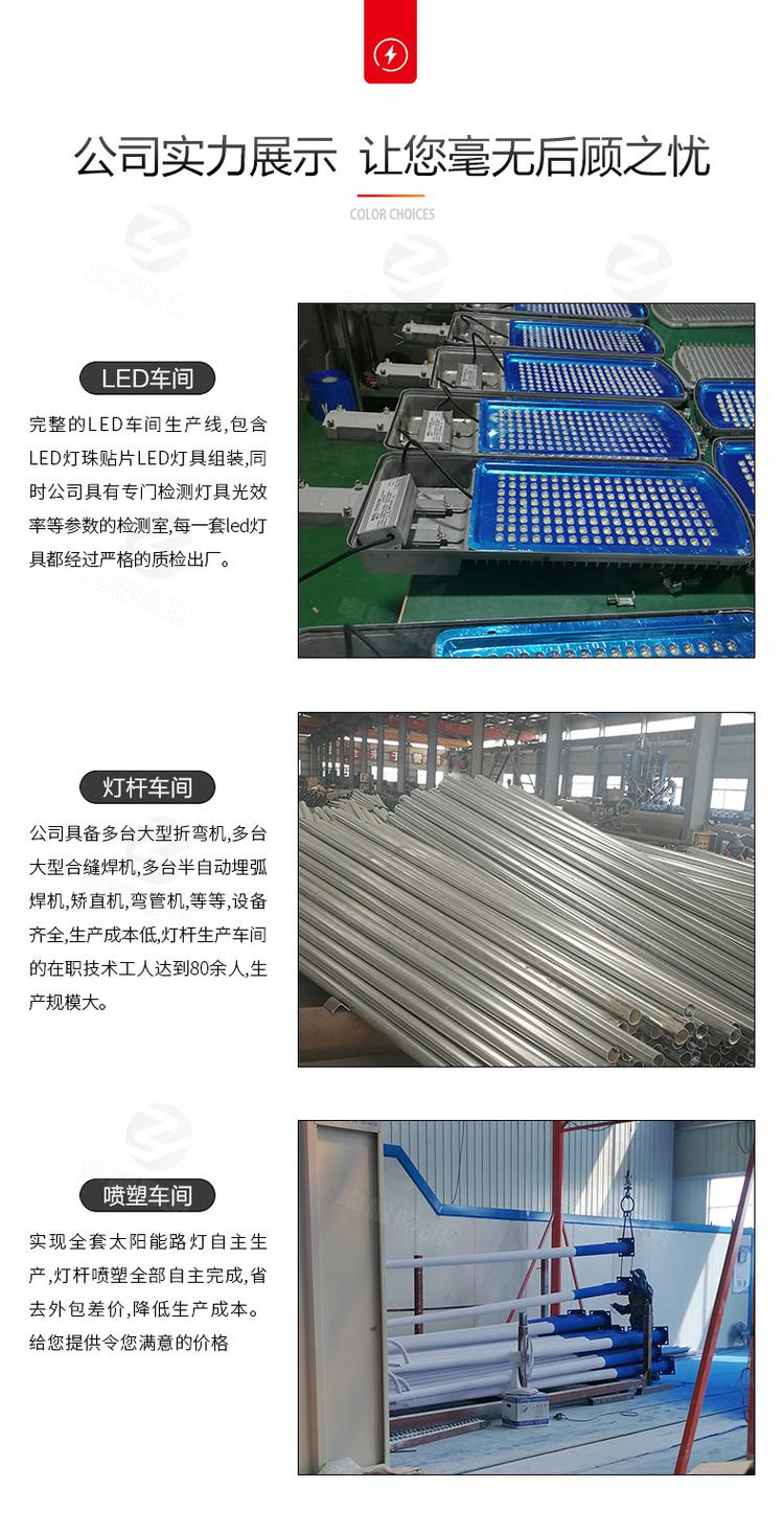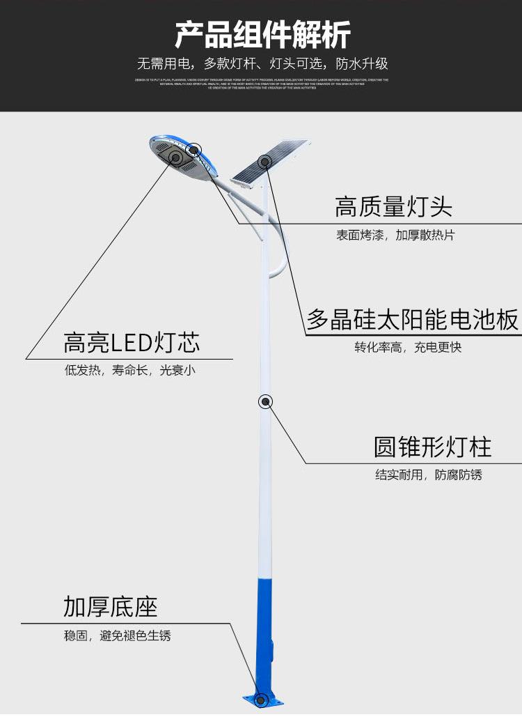 1、组装件:新农村建设5米6米太阳能LED路灯主要由太阳能电池组件、控制器、蓄电池、LED光源、灯杆和结构件等组成。参照太阳能路灯总装图组装太阳能LED路灯。