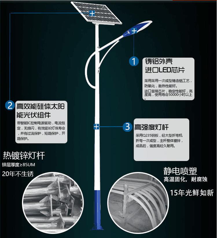 *阴雨天可连续工作365天(按客户要求制作),无需铺设地下线缆,无需支付照明电费,所采用的关键部件太阳能电池板、智能控制器、免维护蓄电池、照明灯具均经过国家光伏产品认证。主要适用于城市道路、小区广场、工业园区、旅游景区、公园绿化带等场所的亮化照明!