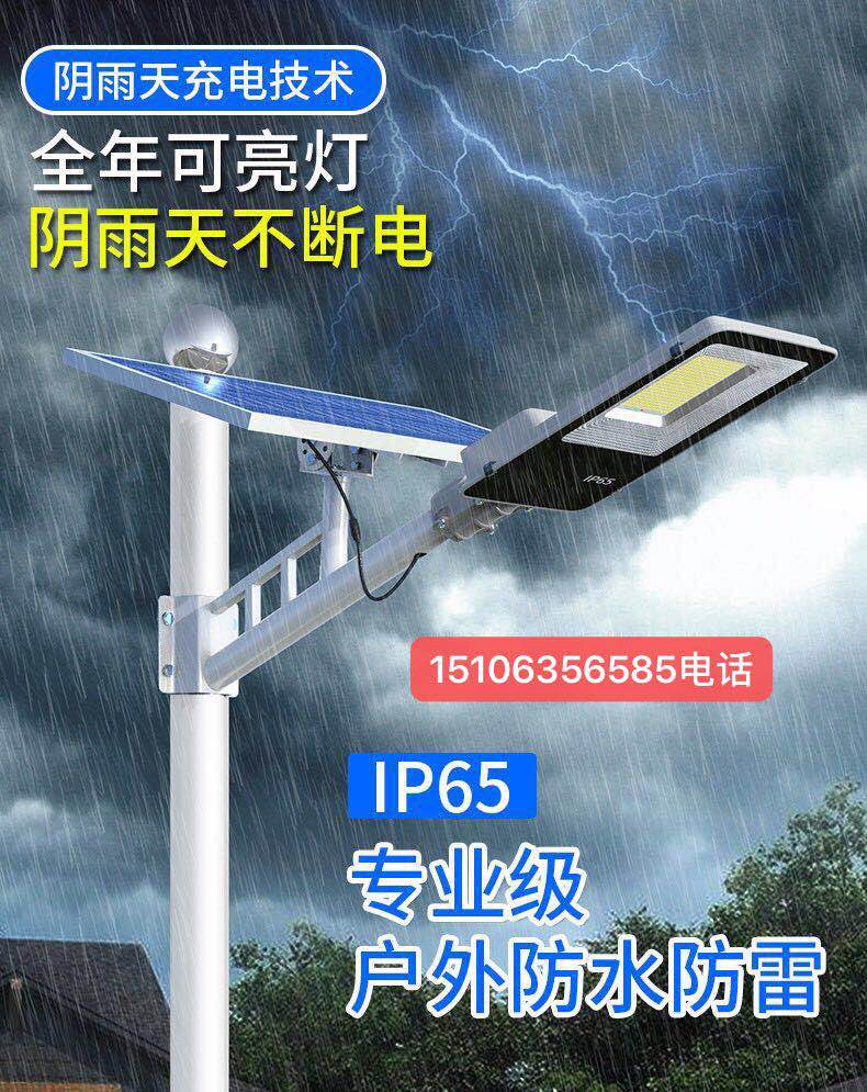 *阴雨天可连续工作365天(按客户要求制作),无需铺设地下线缆,无需支付照明电费,所采用的关键部件太阳能电池板、智能控制器、免维护蓄电池、照明灯具均经过国家光伏产品认证。主要适用于城市道路、小区广场、工业园区、旅游景区、公园绿化带等场所的亮化照明!